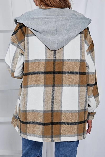 Casual Plaid Draw String Buckle Hooded Collar Outerwear(4 Colors)