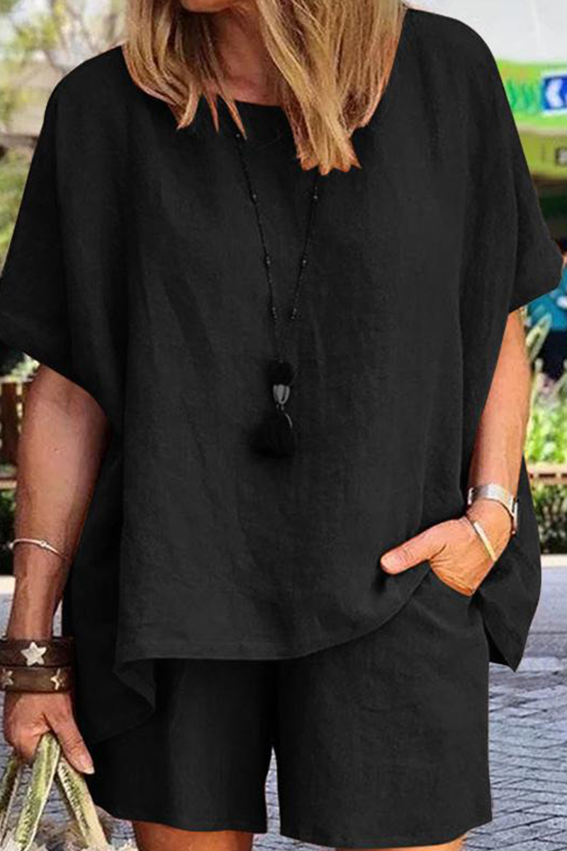 Casual Solid Patchwork O Neck Short Sleeve Two Pieces(4 Colors)
